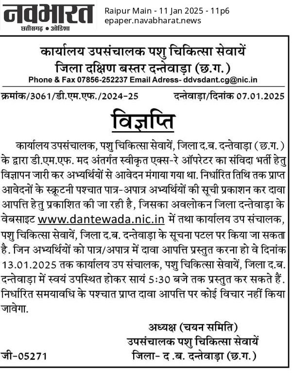 - आवेदन जमा करें (Submit the Application): आवेदन पत्र को उप निदेशक, पशु चिकित्सा सेवा, जिला दक्षिण बस्तर, दंतेवाडा के कार्यालय में हाथ से या पोस्ट के माध्यम से जमा करें।